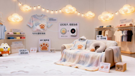 更暗藏多重 “治愈编码”:内领或侧缝缝制 “今天也要软绵绵”“抱我一下,再出发” 等情绪文案,实现专属情感共鸣;部分单品搭载NFC暖声徽章,手机轻碰即可播放呼噜白噪音,即时安抚情绪;多款单品将服饰功能与情感陪伴深度融合,让治愈融入生活细微之处。