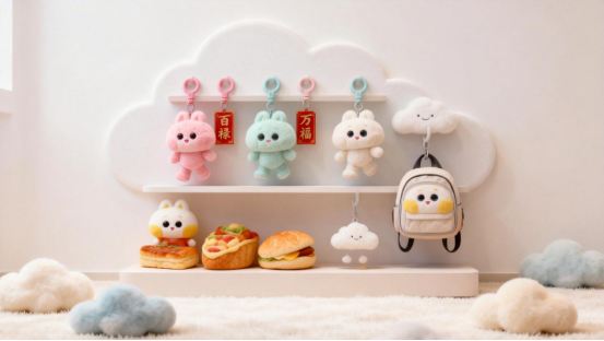 文创潮玩系列打造 “可捏、可抱、可挂、可用” 的多维度陪伴体验,六大专属系列精准适配多元需求:毛绒「国潮蹦跳」系列以回弹颗粒吊扣、磁吸福签尾巴与 3D 美食公仔,实现萌趣与福气兼具;情绪陪伴「粉云脸」系列通过盲盒与磁吸夜灯底座大娃,传递温柔守护;办公室「轻解压」系列的软硅胶捏捏乐、带治愈文案的迷你盲盒,解锁职场小确幸;传统萌化「祥云磁贴」系列以磁吸耳夹与盘扣手链,演绎国潮美学;户外「云朵随行」系列的背包毯与防晒披,兼顾便携与实用;AI 治愈陪伴玩具包含支持情绪识别的标准版、钥匙扣大小的 mini 款及远程留言夜灯,实现智能守护。全系产品选用环保材质,践行社会责任与人文关怀。